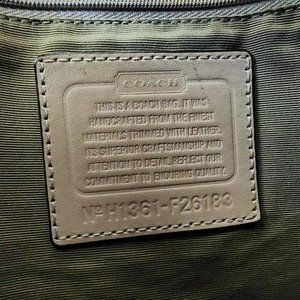 This bag is well-loved, but still has lots of life left. Both top handle have some of the piping either coming off or is off. Signs of wear throughout and shape has relaxed d/t use. Some tarnishing on Coach logo on front of bag.
