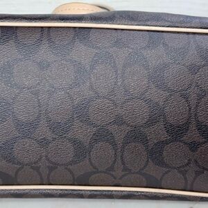 Classic and stylish Coach F26184 Signature Domed Satchel paired with a matching zip-around wallet. Both pieces feature the iconic brown Coach “C” signature canvas with light beige leather trim and gold-tone hardware. Includes: Red hangtag, Coach keychain, and cherry bag charm.