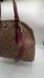 Stylish Coach shoulder bag with signature pattern. Features tan body and burgundy accents. Ideal for everyday use.