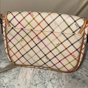 Stylish crossbody bag featuring a plaid design with multicolor accents. Includes adjustable straps for convenience.