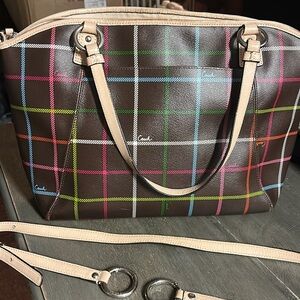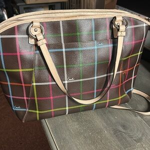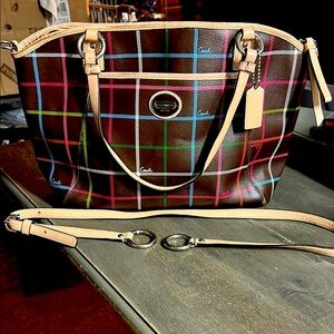Coach Peyton Tattersall Leather Tote F24390 Shoulder Handbag Purse Brown Plaid