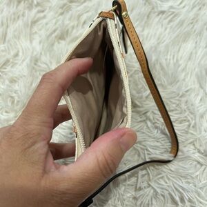 Features a coated canvas exterior with leather trim and comes in a beautiful KHAKI / PINK RUBY color. The wristlet is perfect for those who prefer a small and compact design.