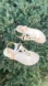 Preowned women’s strappy sandals in good condition in a metallic gold color.