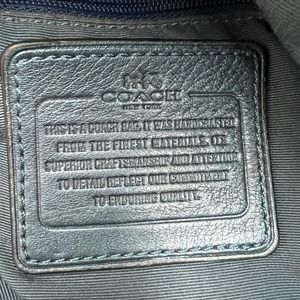 A pretty coach bag in a slightly metallic navy. Style F32723 / F1557. Authentic. In some cases, Coach did not stamp the creed with the style number and instead put a small tag in a pocket. In good condition with a few minor surface marks.