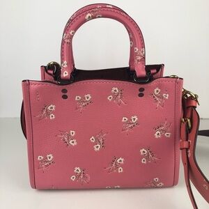 Chic pink satchel with floral design. Features sturdy handles. Perfect for everyday use.