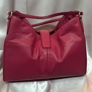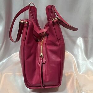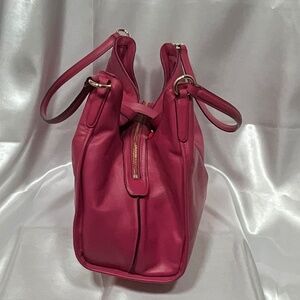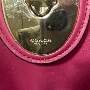 This vintage pink Leather Coach satchel is a rare find. It has 3 separate compartments inside, including a zipper compartment. It has gold tone hardware and a turn key closure.