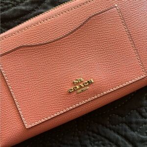 Chic Coach wallet in pink leather. Features sleek design and gold-tone logo.