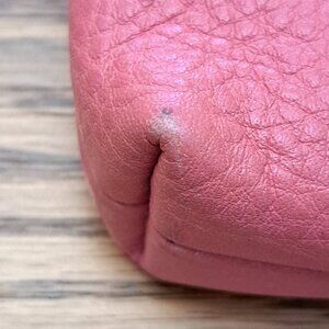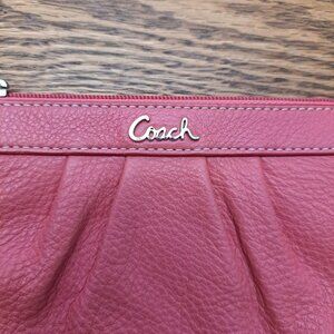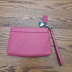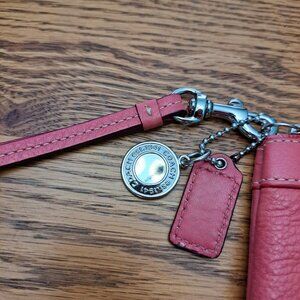 Coach Pink Leather Wristlet With Strap. Preowned. The bag has a flaw in one corner. Features: Removable strap and key chain, zipper closure, and interior pockets.
