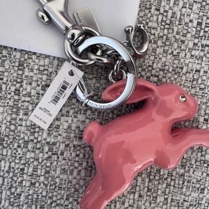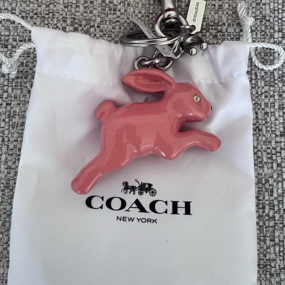 Adorable pink bunny keychain by Coach. Ideal for adding charm to bags or keys.