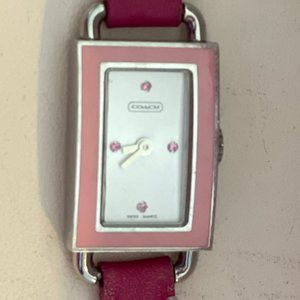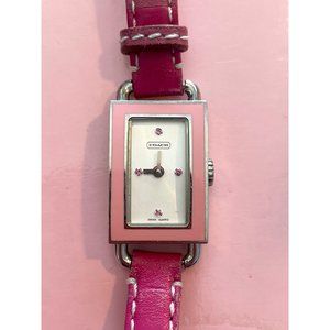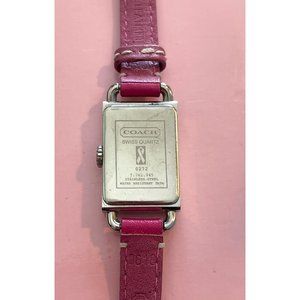 RARE Feminine style Coach Pink Ribbon breast cancer awareness Model 0272 Rectangular Women's Analog Quartz Watch. Very good condition. Minor wear on pink leather strap. Comes with box. 4 pink rhinestones, 2 needles. Replaced the battery one year ago ($30) and it works fine. Swiss Quartz. Stainless Steel. Water resistant (not waterproof).