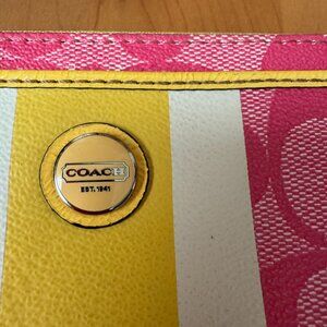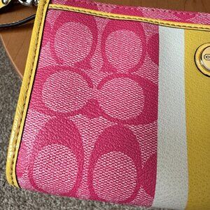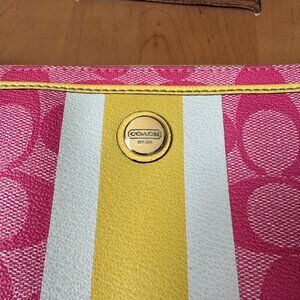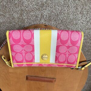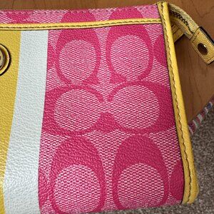 Coach Pink Signature C's w/White & Yellow Stripe & Yellow Trim Wristlet/Wallet