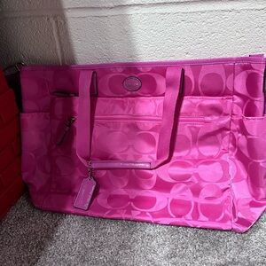 Stylish and spacious, this Coach pink tote bag is perfect for everyday use. Its vibrant color adds a pop of style to any outfit.