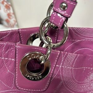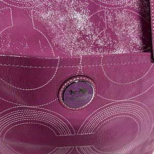 This Coach tote bag in a vibrant pink hue showcases the brand's signature embossed pattern, offering a blend of style and functionality. The spacious design is perfect for carrying essentials, while the durable leather and silver-tone hardware ensure lasting quality. See all photos as they are part of description