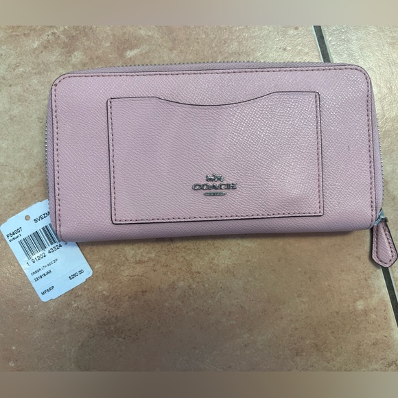 Elegant Coach wallet in soft pink. Features a sleek design with a front pocket and zip closure.