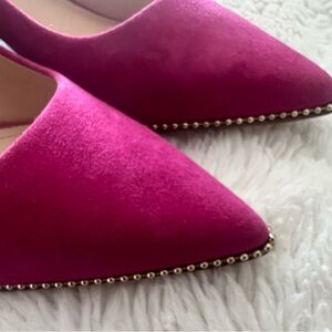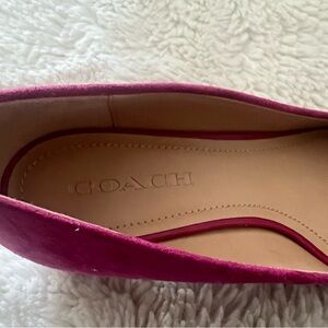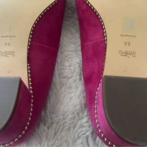 Stylish pink heels by Coach. Features striking gold detailing. Ideal for a bold look.