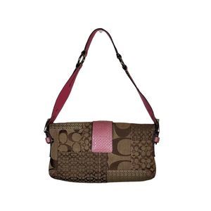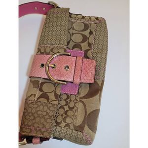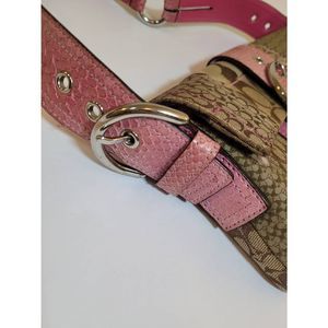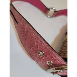 Stylish Coach shoulder bag. Features pink strap and buckle. Brown patterned body. Perfect for any occasion.