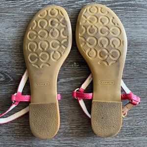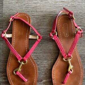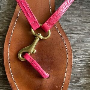 Chic pink sandals with tan straps. Ideal for everyday wear.