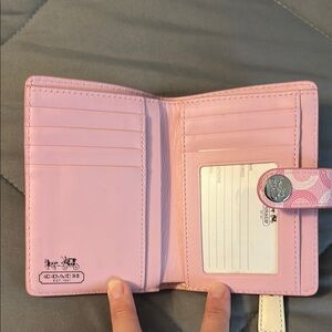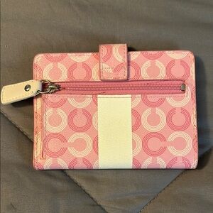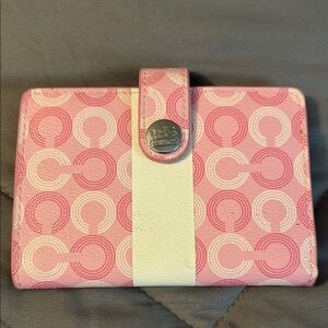 This elegant Coach wallet showcases a sophisticated pink and white color scheme, featuring the iconic monogram pattern. Crafted from durable materials, it offers a timeless design perfect for everyday use.