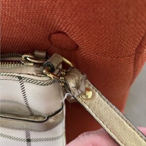 Beautiful Coach crossbody. The strap where it meets the bag looks to have been repaired or an attempt at some point. Doesn’t affect anything. The pictures are the description so please look carefully. I have a Coach wallet as well that I used with this bag. The inside accents of the wallet match the bag pattern.