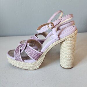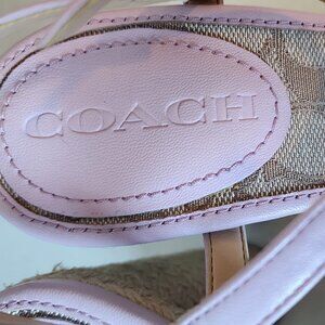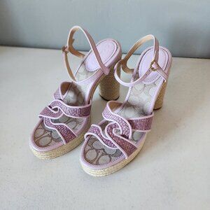 "NEW" Stunning Purple Leather Talina Platform Sandals By Coach. Signature Print Cushioned Foot Bed, Adjustable Ankle Strap, Almond Toe, Raffia Wrapped 1.1/4" Platform & 4.3/4" Oval Heel, Man Made Soles, New, Never Worn, Only Tried On:) Rt.210.00 approx. Size 8.5, Foot Bed Measures 10" For Reference. * Perfect Event/ Party/ Vacation Shoe!