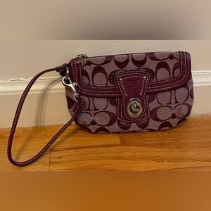 Chic Coach wristlet with iconic pattern. Plum and lavender hues. Perfect for stylish outings.