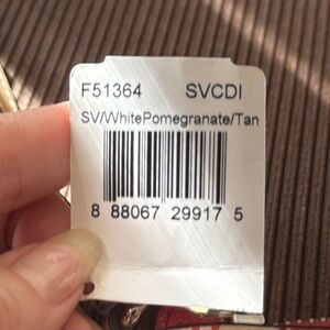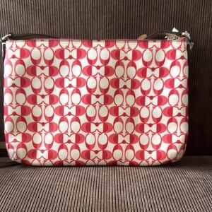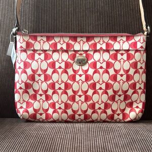 Stylish and elegant, this Coach bag features a vibrant pomegranate and white design. Perfect for any occasion, it combines fashion with functionality.