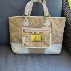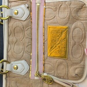 Coach Poppy 2010 Raffia Tote Bag. Zip Closure. Tan Canvas with Cream Leather and Pink Accents on Handles and front Zip. 2 Coach Poppy Zipper Pulls. Interior is Lavender with Zip Compartment and 2 other Pockets. Rubbing on Corners and a couple small marks. front gold logo has a couple creases.