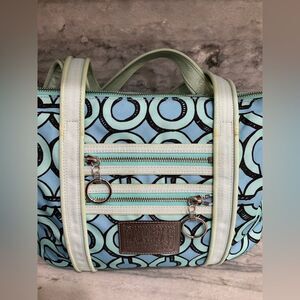 Signature fabric with patent leather trim, double shoulder straps, silver tone hardware, top zip closure, exterior front double zipper pockets, double coach hang tags, and front signature silver poppy patch. Interior is lined with blue sateen fabric and and has a zip, cellphone, and a multi-function slip pockets.