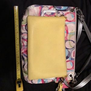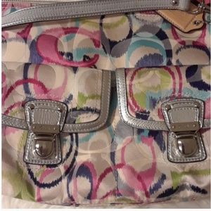 Preowned by me, multicolored , pink. Blue, turquoise, and lime green C's on cream background, still in very good condition with little normal visual signs of wear as shown in pictures and except for flaw on the back of strap shown in picture #5. It has two straps, on cross body (about 17 in drop) and one smaller strap (6in drop) . Inside is clean and purse is authentic Coach