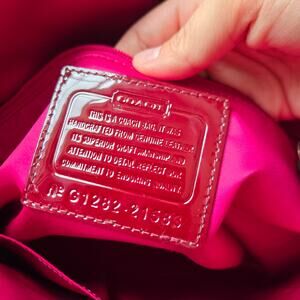 Excellent condition, Coach large slim patent leather Poppy Crimson convertible chain strap shoulder tote bag No. G1282-21583 Retired design, snap closure, gold hardware, double chain/patent leather convertible straps, front zipper pocket, hot pink lined interior with 2 slip pockets and 1 zip pocket.