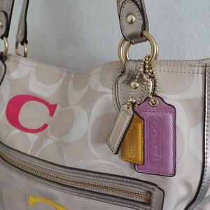 Coach Poppy embroidered Multicolor Signature C tote bag handbag purse. This is a great carry all tote with only very slight marks inside. Comes with 3 hangtags of yellow lavender and gold. Inside is a beautiful teal with one zippered compartment and 2 side pockets. Outside has one zippered compartment as well. Patent leather is a shimmery silvery gray.