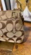Pre-Loved Coach crossbody with kissing C’s pattern. Features tan and brown tones. This bag is in wonderful condition with signs of wear on top edges and metal zipper pulls/d rings, as shown in photos. Interior tag has been cut.