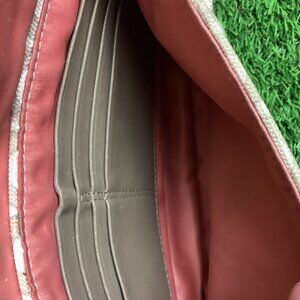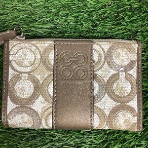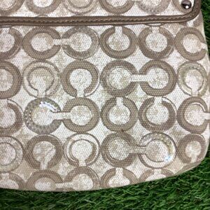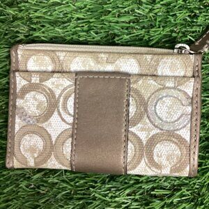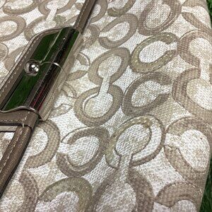 Coach Kristin CC signature logo shoulder crossbody bag and matching card wallet. Wallet has an attached keychain that can be tucked inside. Cream and tan colors with a leather tan strap. The canvas CC sometimes has sequins on the C parts of it. Good used condition.