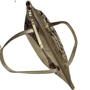 100% authentic Very Very Rare! Coach Poppy Gold Metalic Leather/Canvas Medalion large Tote 16" across, 14" tall, 3,5" deep, handles 9,5". Grate used condition - see pic, ask questions! Some minor marks and wear on leather and trim.