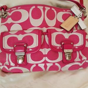 EEUC. Handle is 8 1/2" drop with longer strap of 22" drop for shoulder or crossbody. Top zip closure. Inside zip, 2 slide pockets. Exterior front 2 snap pockets. Fabric lining. Silver toned hardware. Fabulously Fuschia!!!💖💖💖