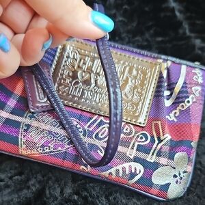 This stunning NWOT Coach Poppy wristlet showcases a captivating tartan purple hue with shimmering iridescent accents. Its compact design and secure zipper closure make it a stylish and functional accessory for any occasion.