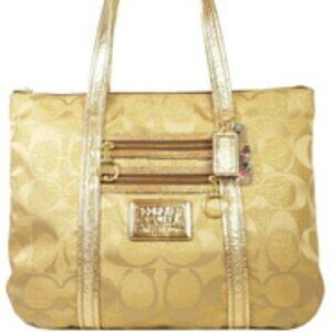 This brand-new bag is a beautiful Coach poppy retired product. It is an exquisite blend of vintage charm and contemporary style. The bag is large in size perfect for storing all your essentials and for on-the-go women. The bag is gold in color crafted with canvas and with the signatures thru out . It features zip closure, gold colored hardware, with logo Coach poppy on front of bag and two zip pockets. There is double leather straps for easy carrying and comfort. The interior is lined with a deep brown colored sateen fabric with two slip pockets and a zippered