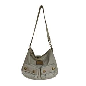 Chic Coach Poppy leather pocket hobo in a soft ivory/cream. Slouchy zip-top silhouette with two front flap pockets (logo button snaps), oversized gold-tone plaque, and lavender lining. Single shoulder strap with dog-clip hardware; roomy everyday size.