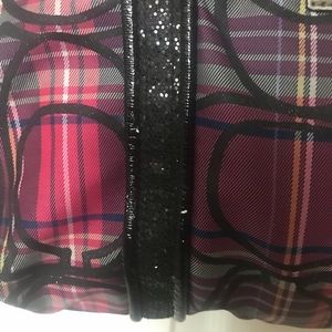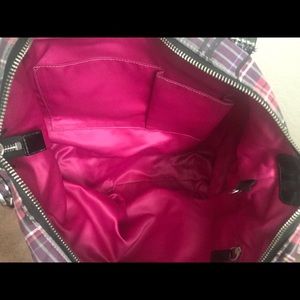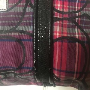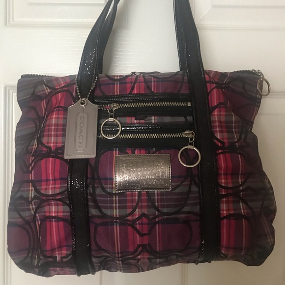 Used Coach Purse with slight wear and tear. Inside has slight staining from dirt and ink. Outside cloth slightly dirty but no visible tears. Visible scratches on handles on outside of front of Purse with a slight tear on one strap on the back of Purse. Smoke-free home. Zippers work.