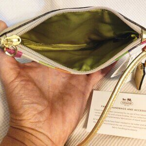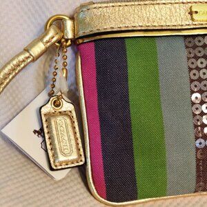 NWT Coach Poppy Sequin Legacy Stripe Small Wristlet in Brass/Multicolor Canvas w/Gold Metallic Leather, .5x4.25x6", Style #44910, Produced 2011, Retail $48. Ships in Original Packaging from Macys, with Care Card.
