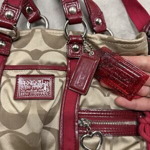 Coach Poppy Signature C Satchel Tote Bag Khaki With Red Accent F20101. Condition is Pre-owned - Good. Shipped with USPS Ground Advantage.