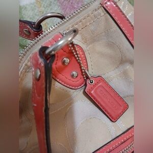Elegant Coach shoulder bag in beige with coral details. Features signature pattern and front zipper pocket.