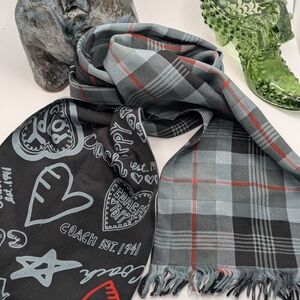 Stylish Coach 2 sided silk scarf with heart designs. Features black and red colors.