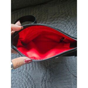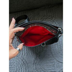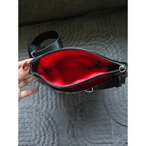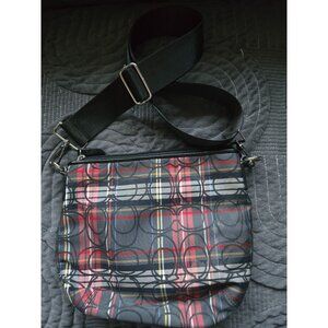 Cute Coach Poppy crossbody bag. Features a glittery signature print on tartan. Primary tartan colors are black and red with black leather trim. Black nylon strap can be adjusted for crossbody or shoulder wear. Features one slip exterior pocket. Zipper closure with one small zippered pocket inside. Interior is red sateen fabric. Approx. dimensions are 9 1/2 in. X 8 1/2 in. X 3 in. Please see all pictures as part of description.