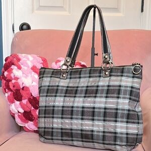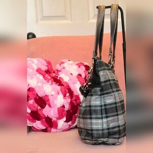 I love the Poppy bags and I'm glad they're getting the love they deserve. This one is in a blue and black tartan with red and silver accents. She's managed to hold onto both hang tags! Patent leather trim.