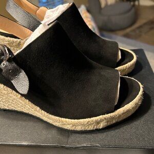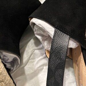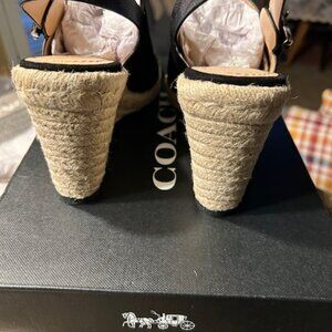 Color: Black. Breezy espadrille lift and sturdy slingback styling completes both dressy and casual looks in this Poppy wedges by coach. Suede and Signature coated canvas upper, Buckle closure, Man made leather lining, Leather footbed. 2-1/2'' heel. Imported. NEW. In original packaging.