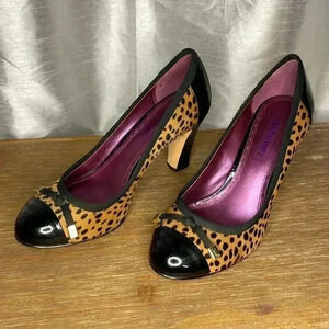 Coach Poppy Women’s 7B Patent Black Leather Animal Print Fur Heels