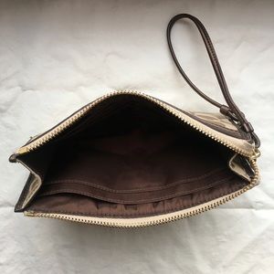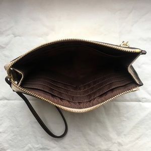 Coach Poppy signature canvas and leather wristlet with semi-detachable strap, 2 zipper pockets, 1 exterior slip pocket, 3 interior bill pockets & 6 card pockets. Barely used, great condition!