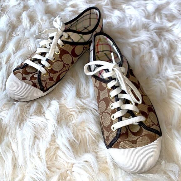 Coach Poppy Zorra Khaki Brown Signature Multicolor Tattersall Sneakers Size 8.5