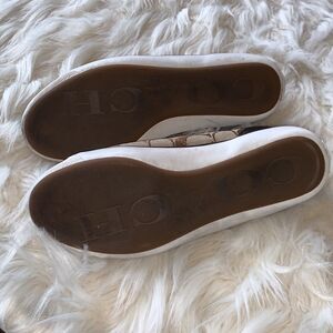 Upper is constructed of water-resistant and stain-resistant classic Coach signature jacquard canvas fabric Chocolate brown leather trim A one inch wide band of unique Coach tattersall multicolor fabric at the collar of the shoe adds the absolute perfect touch to make this shoe truly a special "standout"! Lightly padded insole with Coach signature "Coach Leatherware Est. 1941" on brown leather tongue patch and on rubber heel patch Protective rubber toe cap Skid-resistant rubber outsole with large Coach signature